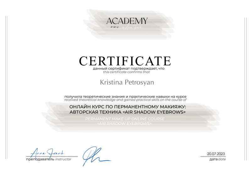 In 2024 ging ik naar Polen om een nieuwe techniek van oogschaduwvervaging te leren van de Wereldkampioene ,Kampioene van Wit-Rusland en Oostenrijk Valeria Vasilyeva. Deze ervaring heeft niet alleen mijn kennis verrijkt, maar stelde me ook in staat om klanten een breed scala aan diensten aan te bieden, inclusief poeder wenkbrauwen, haarstreep techniek, lippen pigmentatie en ooglidvervaging, evenals het verwijderen van oude permanente make-up.